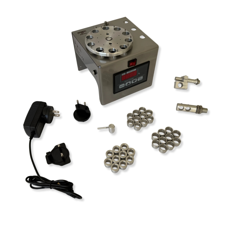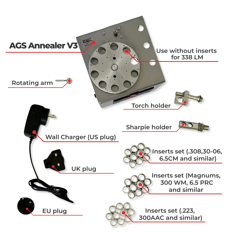 AGS Brass Case Annealer 3.0 โ€“ per calibri multipli, con controller PWM digitale (regolabile da 2,5 a 10 secondi) e inserti intercambiabili, e piรน alto delle due versioni precedenti. Sono inclusi tre set di inserti: un set รจ per bossoli .223 e simili (con apertura da .402″ a 10,2 mm), un set รจ per bossoli .308 e simili (con apertura da .492″ a 12,5 mm) e un set รจ per bossoli con base .532 e simili (con apertura da .543″ a 13,8 mm). Utilizzare senza inserti per .338 e simili (apertura .622″ โ€“ 15.8 mm).