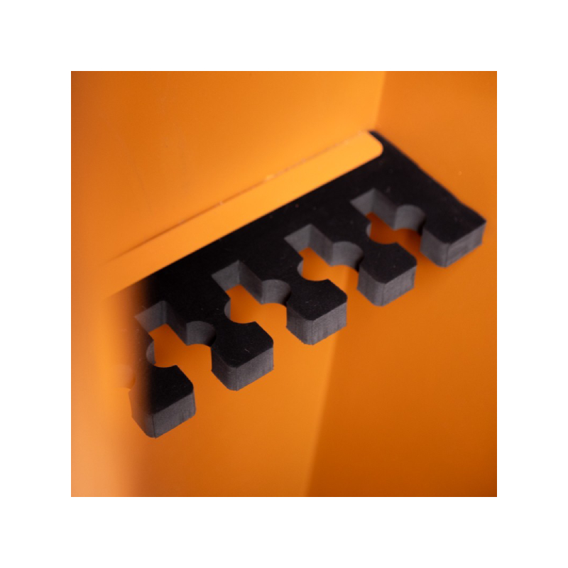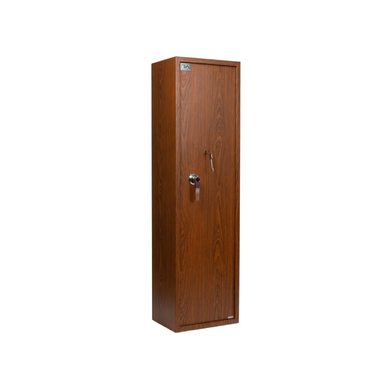 Armadio blindato per fucili con finitura esterna color legno. La chiusura รจ composta da 3 tenoni con diametro da 20mm e la serratura รจ a chiave con maniglia di apertura. L’armadio รจ dotato di tesoretto superiore con serratura a chiave. La rastrelliera in spugna รจ fissa. La base รจ rivestita in feltro e sono presenti 4 fori per l’ancoraggio a parete.