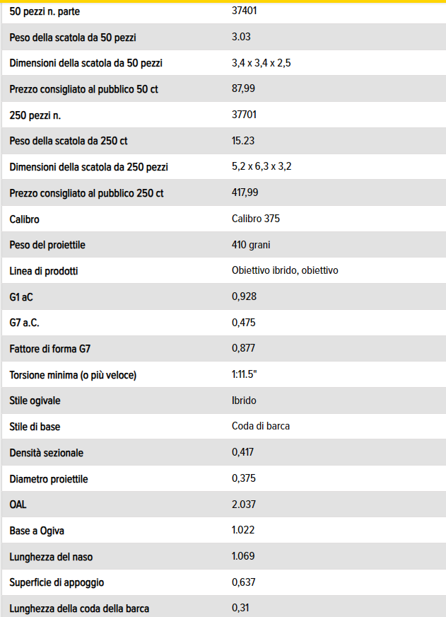 bbiamo realizzato questo proiettile estremamente robusto per resistere alle condizioni estreme di impatto delle cartucce magnum calibro 375. Presenta la concentricitร  senza precedenti, inferiore a 0,0003″, che ci si aspetta dalle nostre leggendarie J4 Jacket. Progettato con geometria ibrida dell’ogiva che offre prestazioni balistiche eccezionali e una giornata di ricarica senza problemi, grazie alla facile messa a punto durante lo sviluppo della carica. Il proiettile calibro 375 da 410 grani รจ estremamente costante, verificato Doppler con una variazione del coefficiente balistico inferiore all’1%!