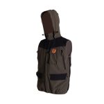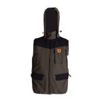 let in tessuto rip-stop elasticizzato verde con profilo arancio fluo. Idrorepellente con cappuccio staccabile con zip tasca porta palmare 2 tasche sul dorso di 20 cm con zip 2 tasche al fondo con patta fluorescente estraibile e con zip, una tasca interna e carniere grande con 2 zip.