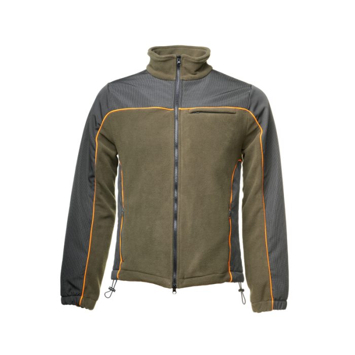 Pile in ottimo tessuto di 340 grammi al MT quadro, con applicazioni in tessuto tecnico antispino e antirovi con aggiunta di profili in tessuto fluorescente colore arancione; zip con doppio cursore, coulisse al fondo, 2 comode tasche laterali con zip e tasca lato cuore con zip; protezioni in tessuto tecnico su braccia, spalle e schiena. Carniere su retro.