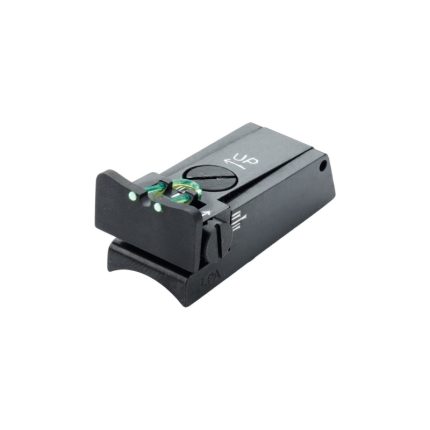 Tacca di mira regolabile LPA in fibra ottica per fucile. Regolabile in altezza e derivazione tramite solide viti a click. Base da saldare sulla canna. Con un corpo molto compatto e profilo basso (per fucile).